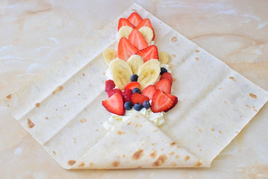 Для приготовления сладкой шаурмы подготовьте необходимые ингредиенты. Фрукты и ягоды можно взять любые по своему вкусу.