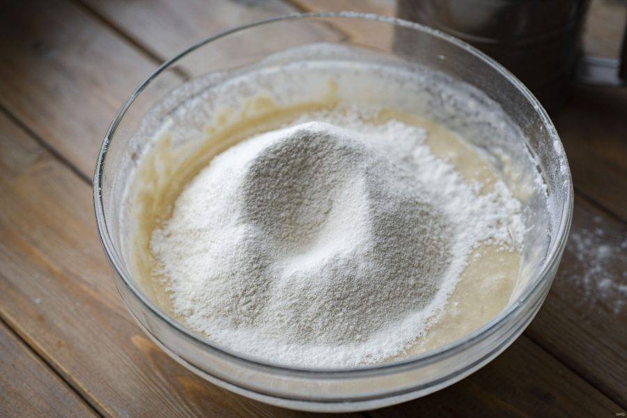 Теперь частями просейте муку и начинайте замес. Я сначала вмешивала муку ложкой, а затем начала вымешивать руками. Контролируйте консистенцию теста, аккуратно добавляя муку в процессе замеса. Возможно вам потребуется чуть больше или чуть меньше указанного количества муки.