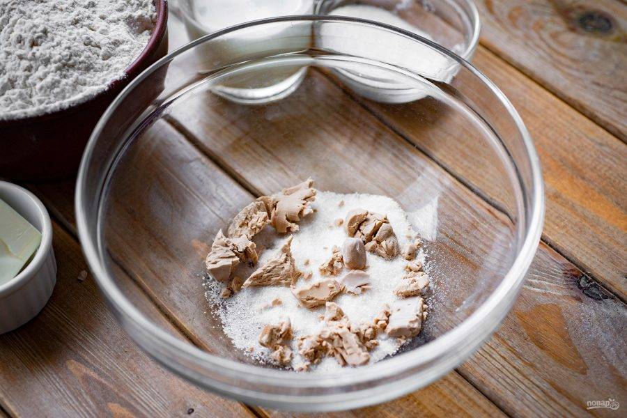 В миску пальцами разотрите дрожжи, добавьте одну столовую ложку сахара.