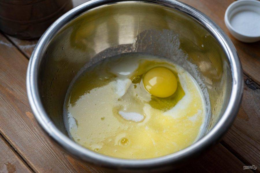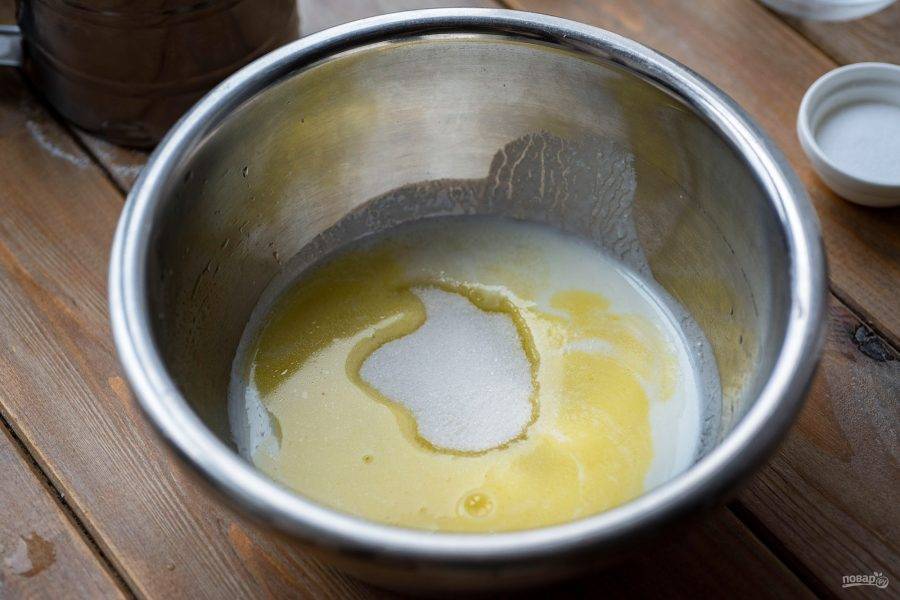 Теперь в отдельную миску залейте теплый кефир, растопленное сливочное масло, высыпьте весь оставшийся сахар, добавьте ванилин.