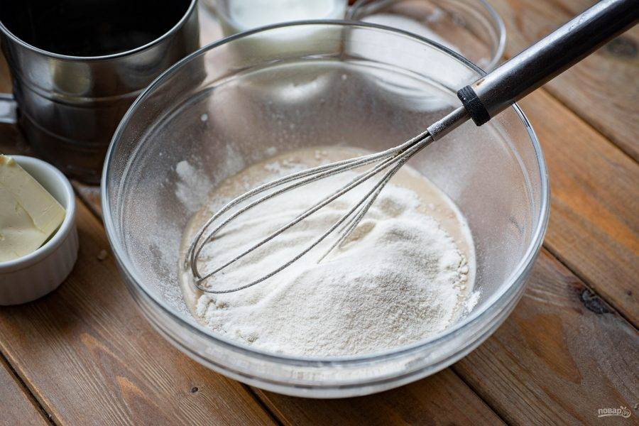 Залейте теплое молоко и размешайте эти ингредиенты венчиком до полного растворения дрожжей.