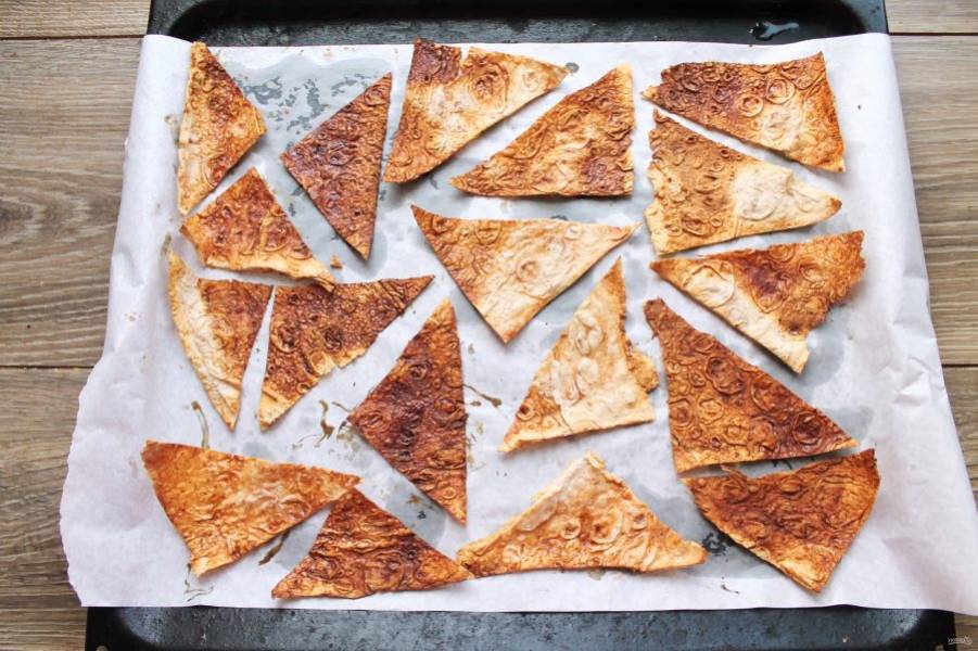 Поставьте противень в горячую духовку и выпекайте в течение 5-6 минут при температуре 180 градусов. Остудите и подавайте чипсы на стол.