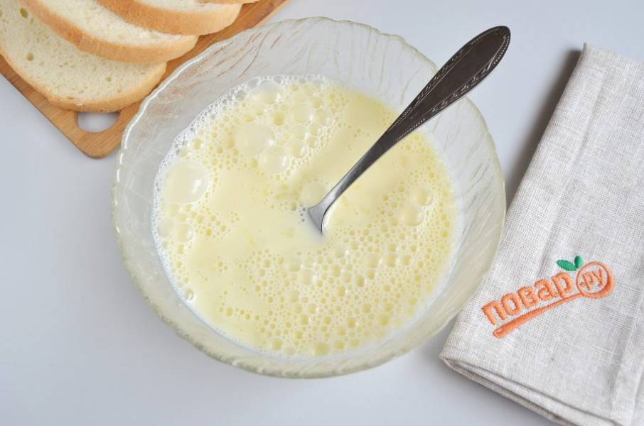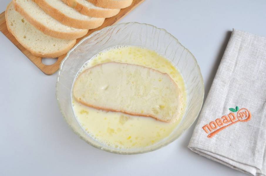 4. Поставьте сковородку на огонь, положите кусочек сливочного масла. Каждый ломтик хлеба окунайте в молочную смесь, чтобы с двух сторон хлеб пропитался.