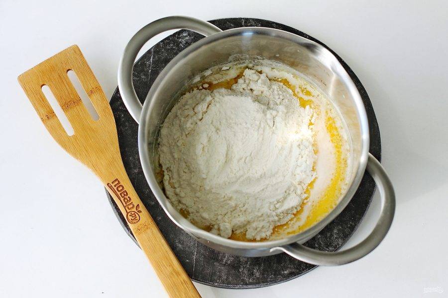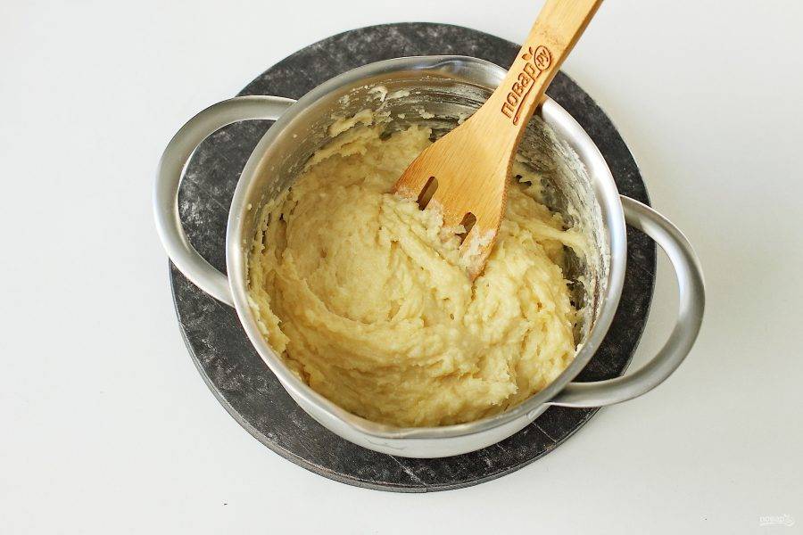 Затем дайте получившейся массе немного остыть, и постепенно добавьте яйца, каждый раз тщательно вымешивая тесто.
