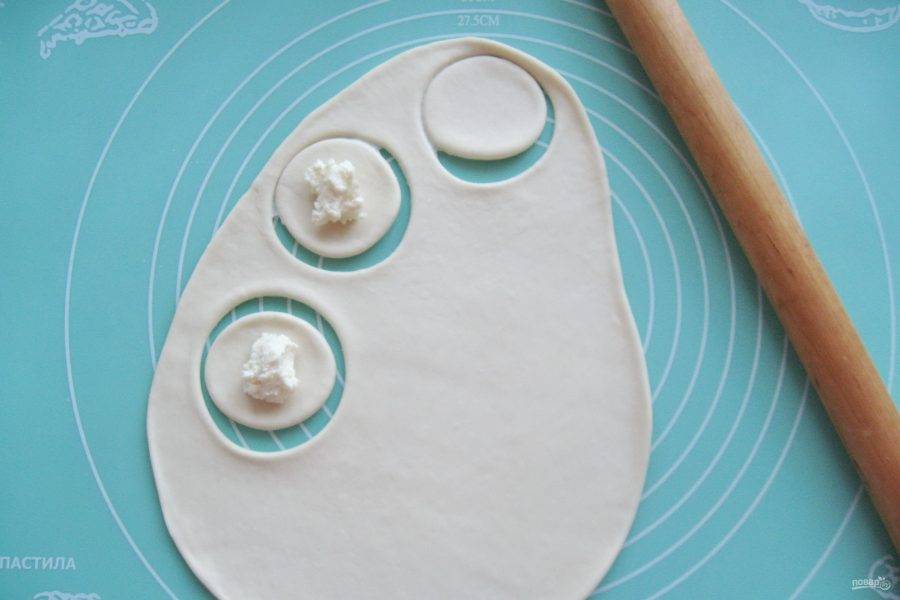 Тесто раскатайте в тонкий пласт. Любой выемкой сделайте кружки. На каждый кружок выложите порцию начинки.