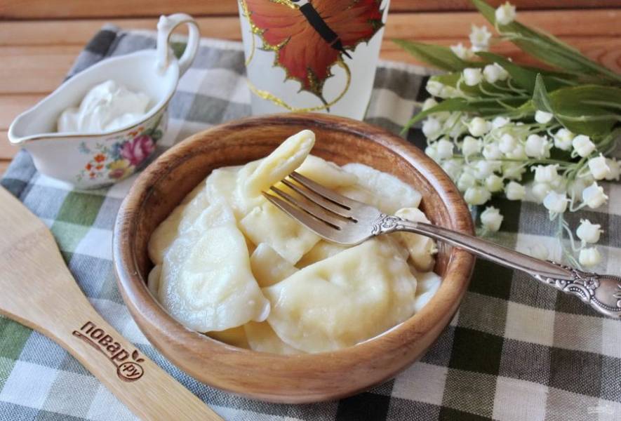 Сладкие вареники с творогом готовы. Подавайте к столу со сметаной, сливочным маслом.