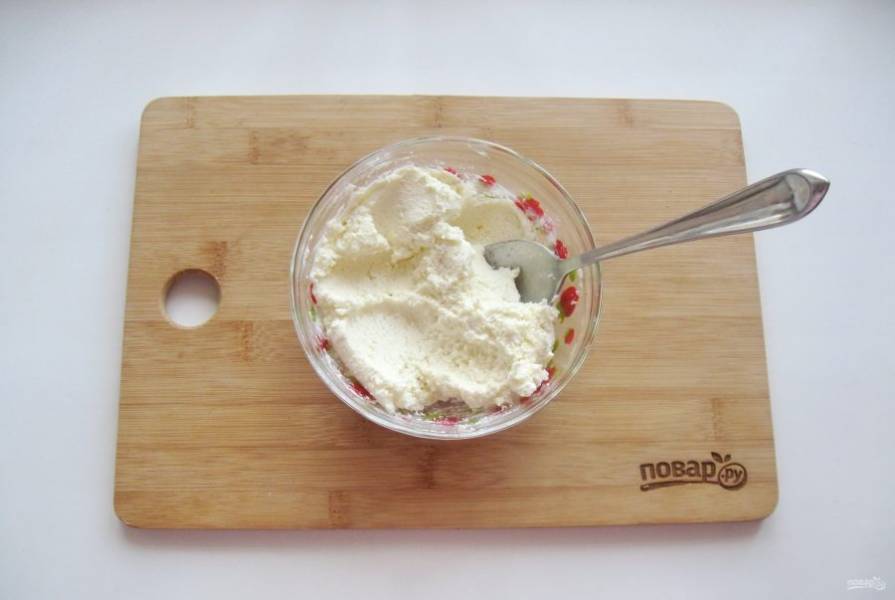 Приготовьте начинку для вареников. В мисочку выложите творог. Добавьте сахар по вкусу.
