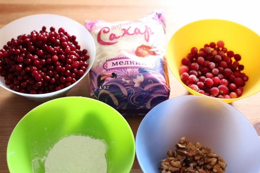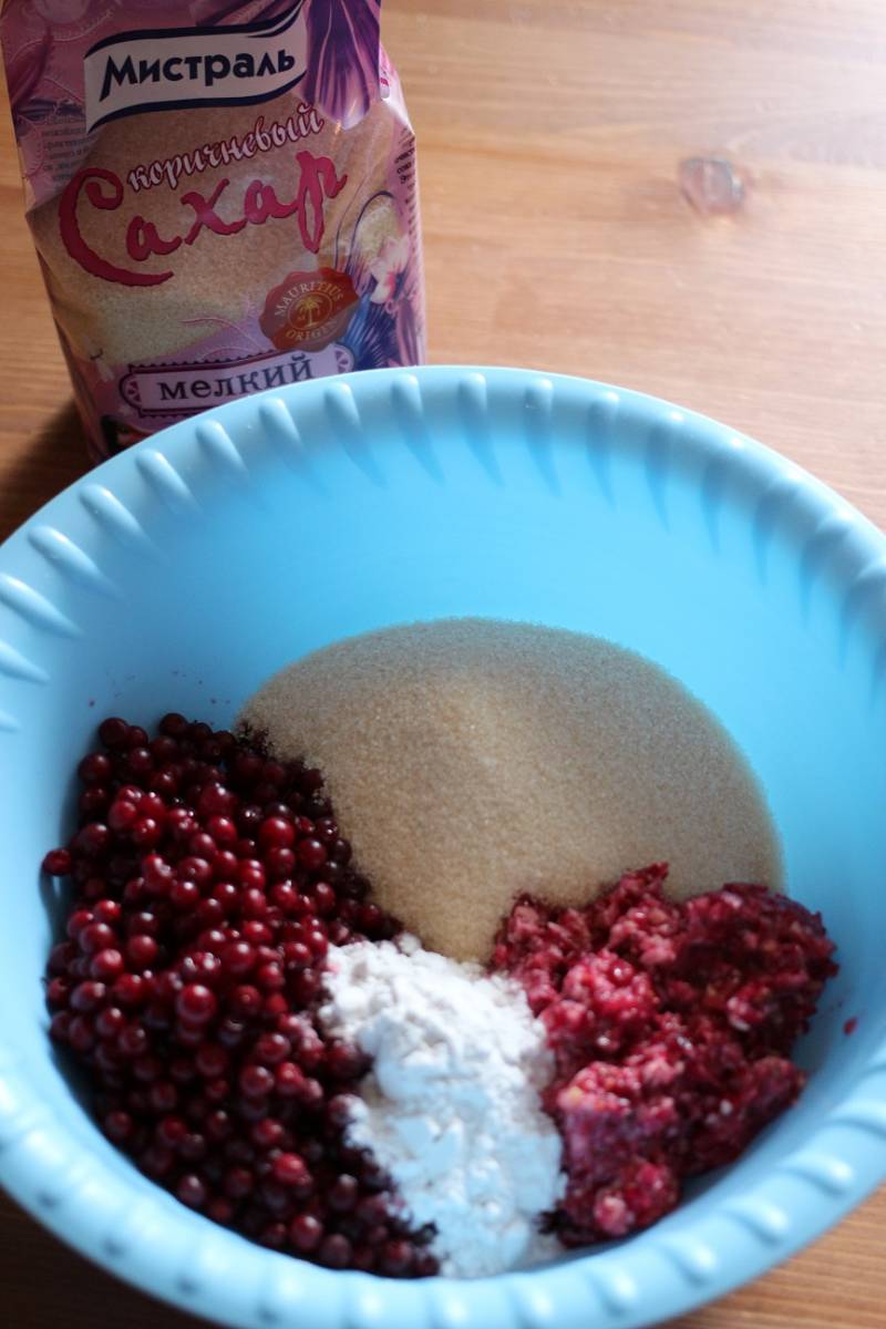 Клюкву измельчить блендером вместе с грецким орехом, смешать все ингредиенты начинки: бруснику, клюкву, сахар, орех и крахмал.