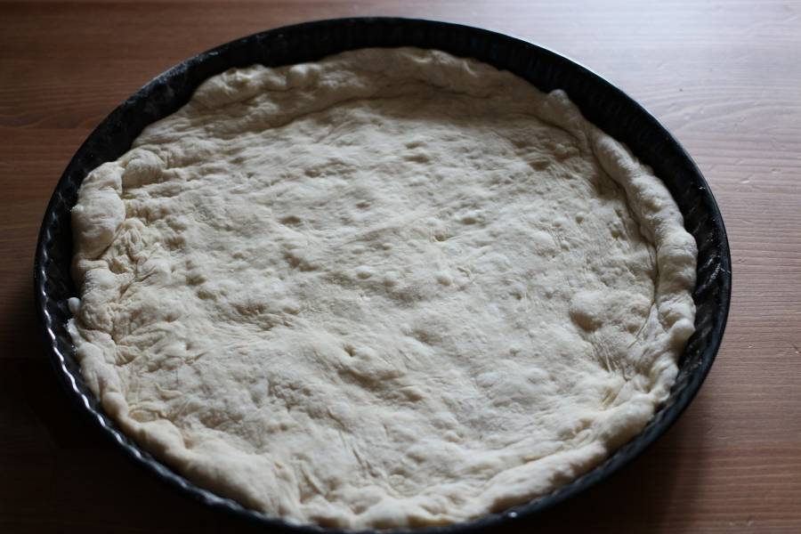 6. Как только тесто поднимется и увеличится в объеме вдовое - тесто готово. Часть теста распределить по форме.