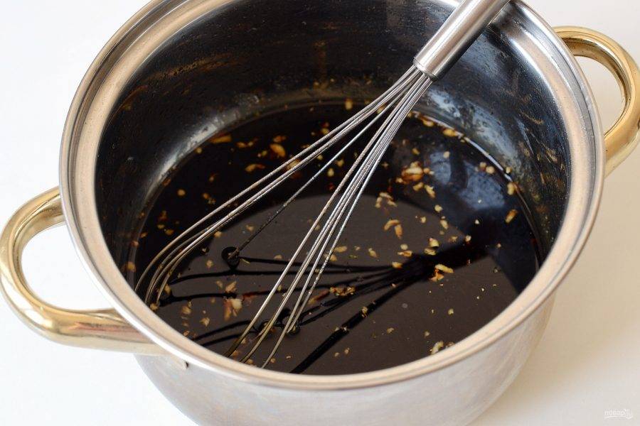 Влейте соевый соус. Доведите до кипения и уваривайте до состояния густого соуса. Примерно 30 минут.