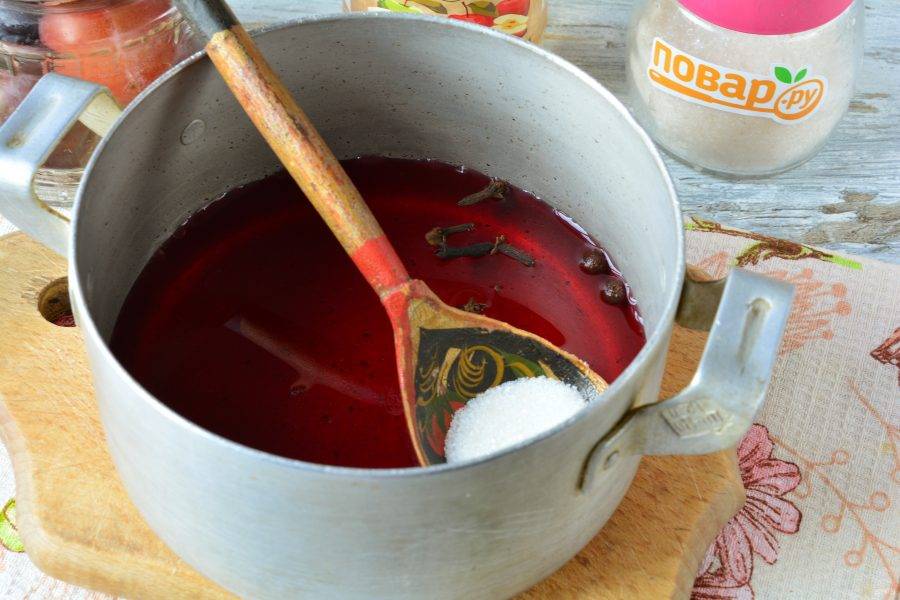 Слейте жидкость со слив в кастрюлю, всыпьте сахар, влейте яблочный уксус и закипятите сироп.
