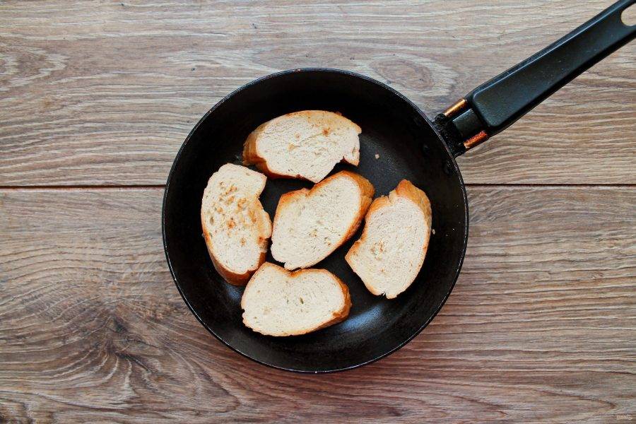 Нарежьте багет на кусочки и обжарьте в сухой сковороде с двух сторон. Нанесите намазку на тосты и подавайте.
