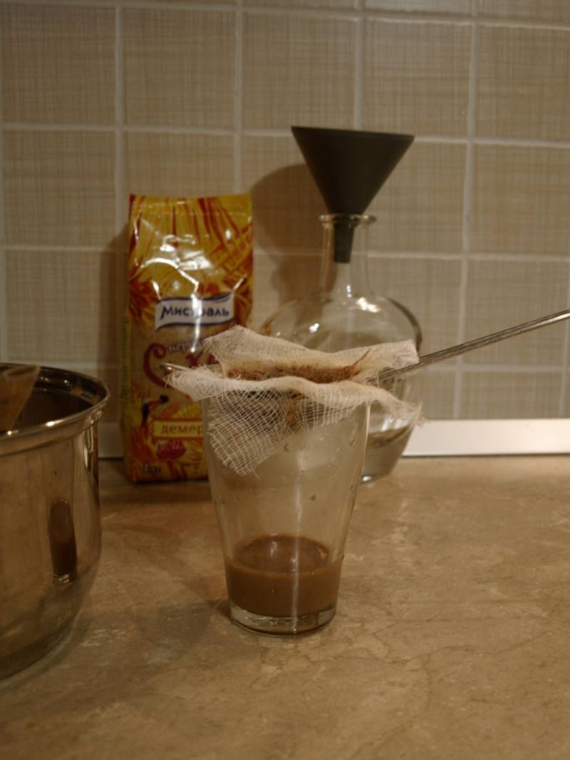 Готовый ликёр процеживаем через марлю и переливаем в бутылку. Цедить через марлю долго, но это нужно сделать. Так как иногда сливки сворачиваются. Я цедила через марлю, но потом убрала её и ликер получился с вкраплениями, но на его вкус это никак не повлияло)))