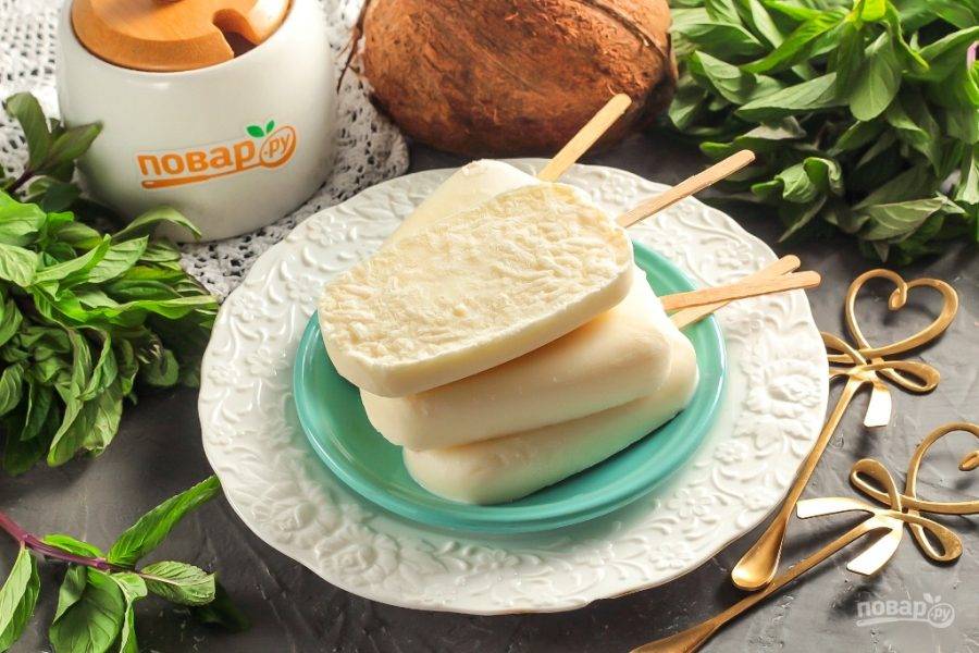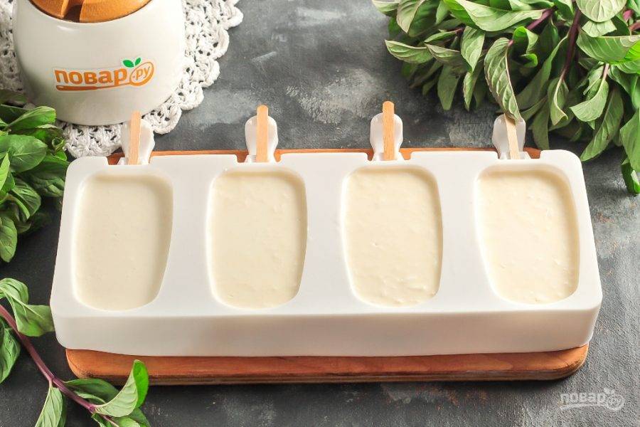 Затем перелейте кокосовую массу в формочки для мороженого и вставьте в них деревянные палочки. Поместите форму в морозильную камеру на 4-5 часов до полного застывания.