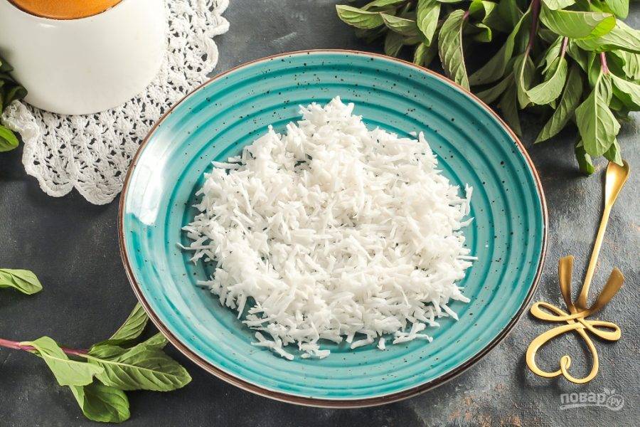 Срежьте кожуру с мякоти кокоса и натрите ее на терке с мелкими ячейками. Если кокоса нет в наличии, то используйте магазинную кокосовую стружку любого цвета и кокосовый ароматизатор.