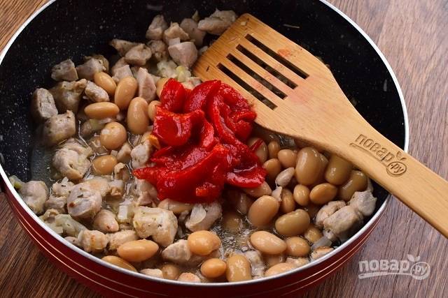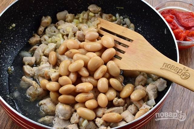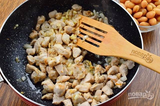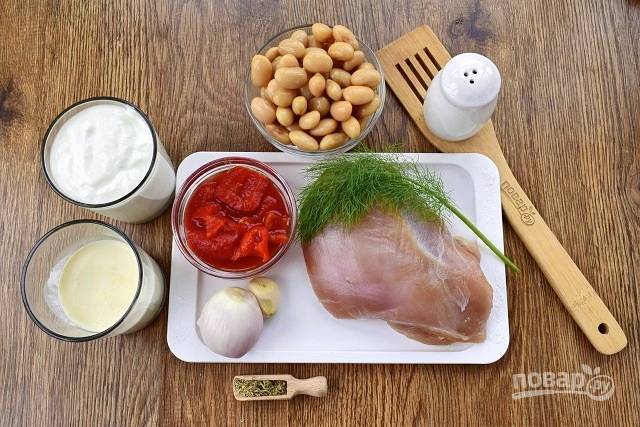 Куриную грудку помойте, обсушите. Лук и чеснок очистите. Консервированную фасоль откиньте на дуршлаг.