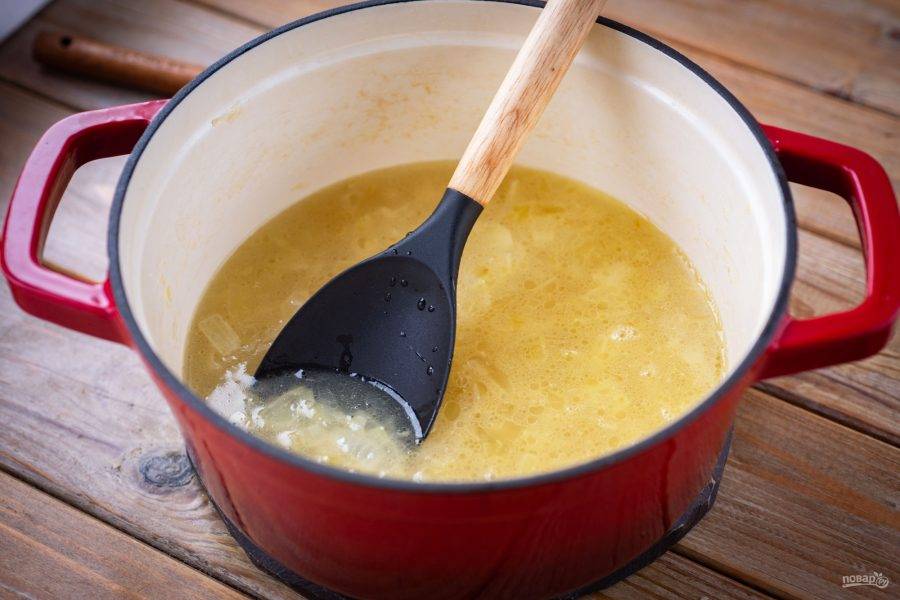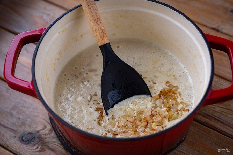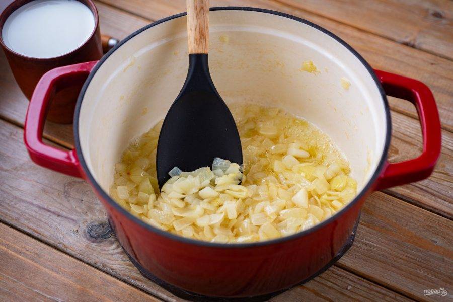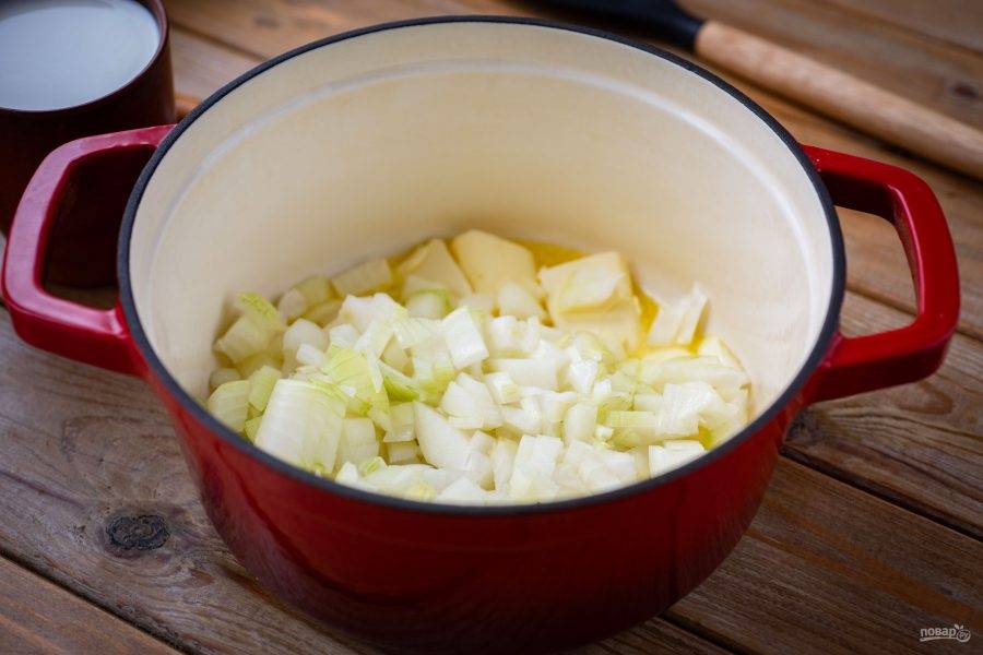 В толстодонной кастрюле на среднем огне растопите 50 грамм сливочного масла и выложите к нему мелко нашинкованные четыре луковицы.