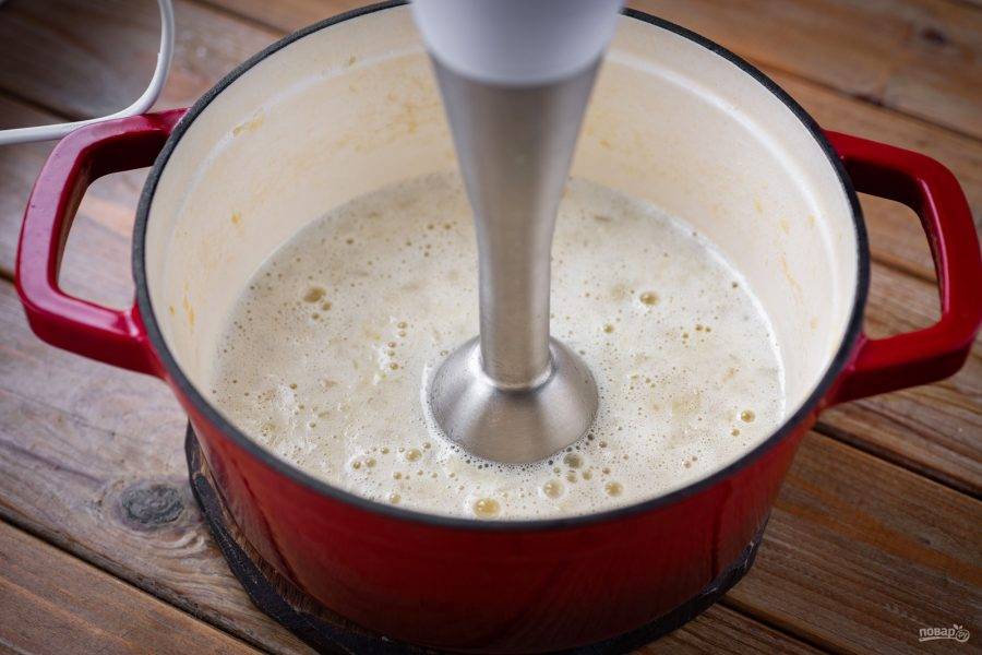 Затем погружным блендером перебейте суп до получения однородной смеси.
