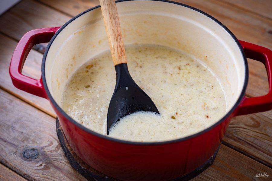 Залейте сливки, перемешайте, хорошенько прогрейте, не доводя до кипения и снимите кастрюлю с огня.