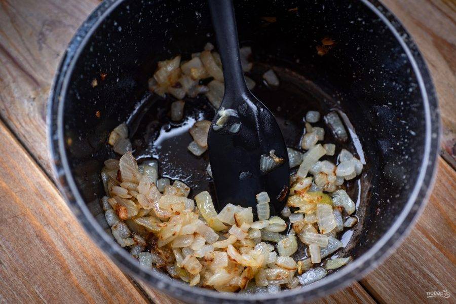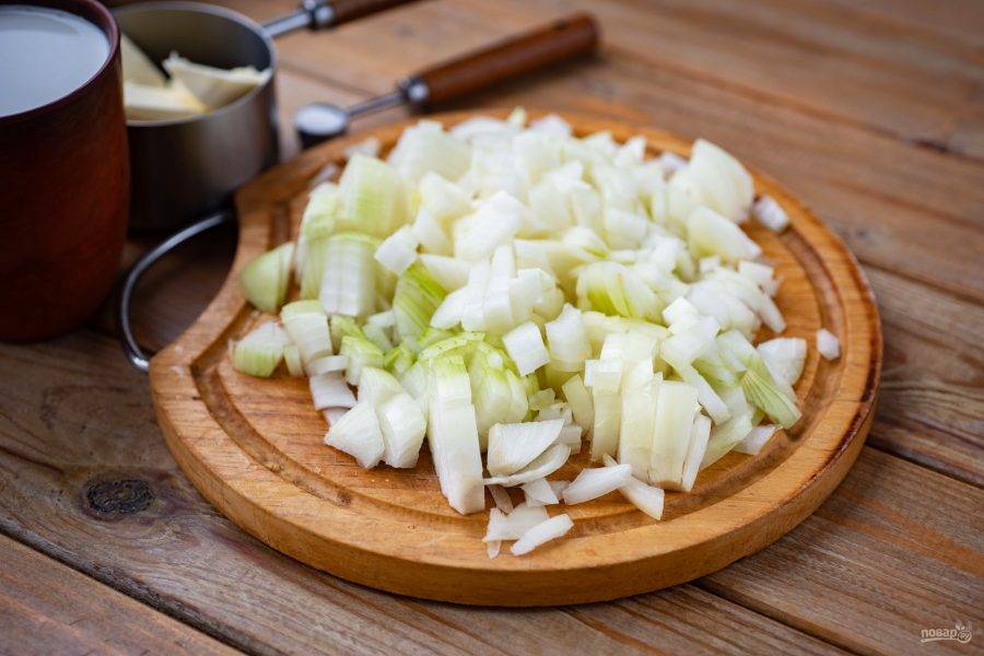 Лук репчатый почистите и нашинкуйте мелкими кубиками луковицы из пяти.