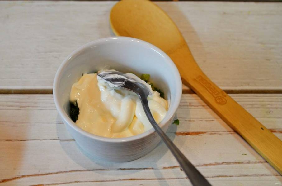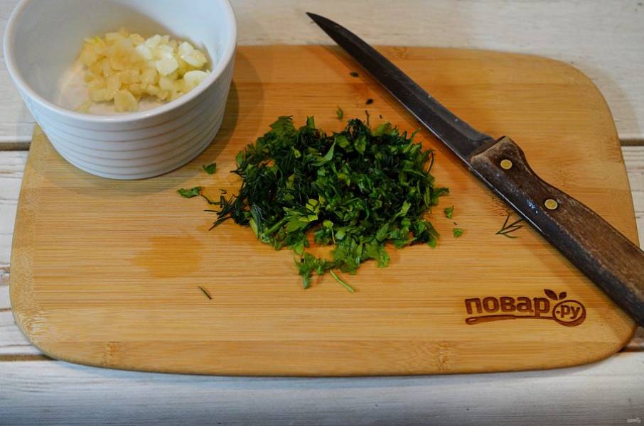 4. Всю зелень нарежьте и добавьте к чесноку.