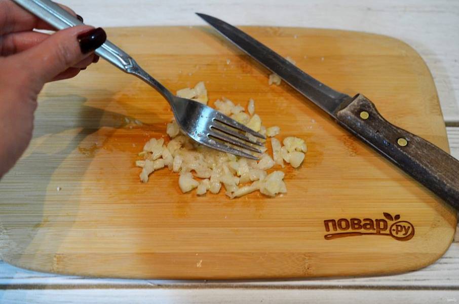2. Добавьте к чесноку соль и разомните всё вилкой.
