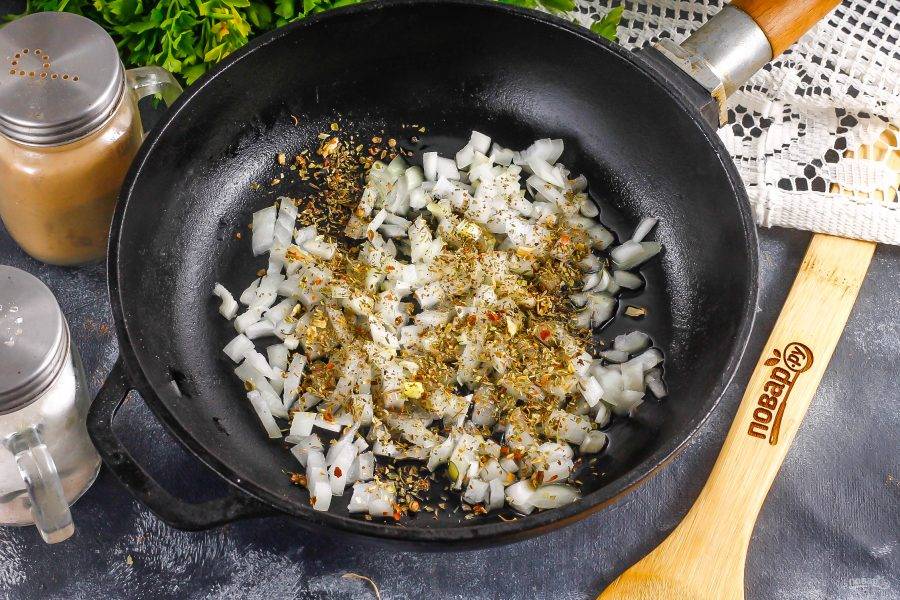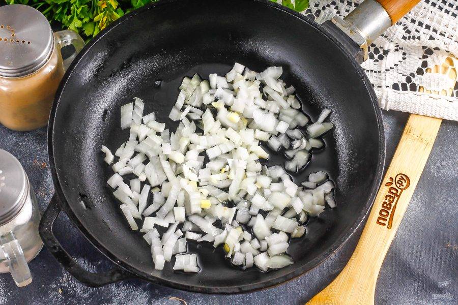 Репчатый лук очистите от кожуры и промойте в воде. Нарежьте мелкими кубиками и высыпьте в сковороду с прогретым растительным маслом без аромата.