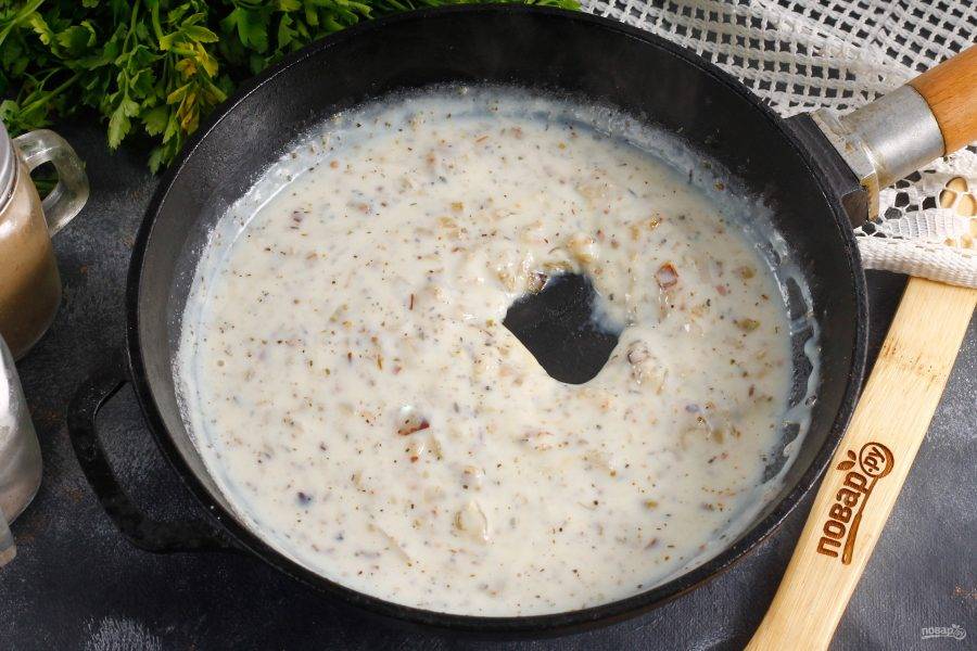Томите на минимальном нагреве примерно 1-2 минуту до загустения, но помните, что после остывания соус станет более густым. Поэтому оптимальный вариант, когда от силиконовой лопатки или ложки остается след. Выключите нагрев.