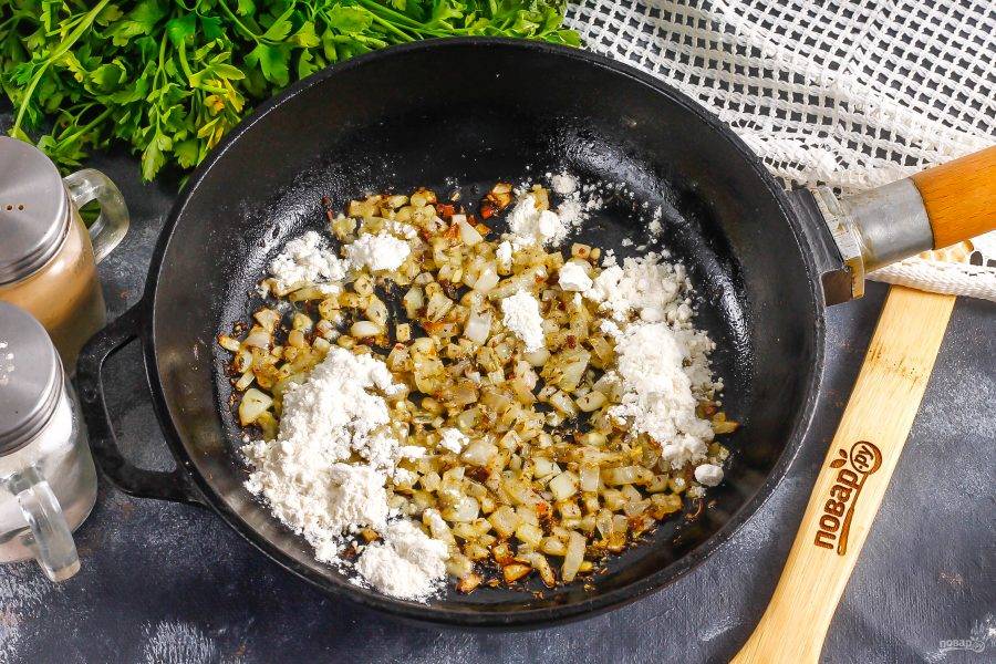 Обжарьте лук и базилик примерно 2-3 минуты до румяности. Добавьте пшеничную муку и тщательно вымешайте силиконовой лопаткой, чтобы она впитала в себя масло и чуть поджарилась. Примерно 1 минуту.