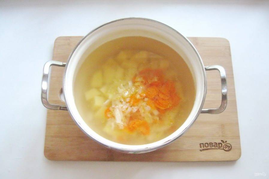 После выложите морковь и лук в кастрюлю. Добавьте лавровый лист, посолите и поперчите по вкусу. Варите до готовности овощей.