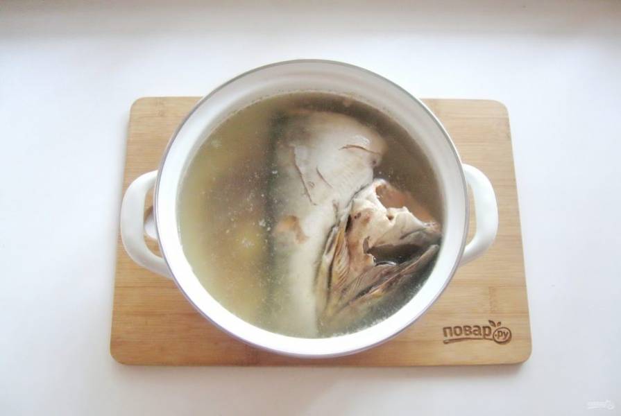 Рыбный бульон процедите и выложите нарезанный кубиками картофель. Поставьте на плиту и начинайте варить суп.