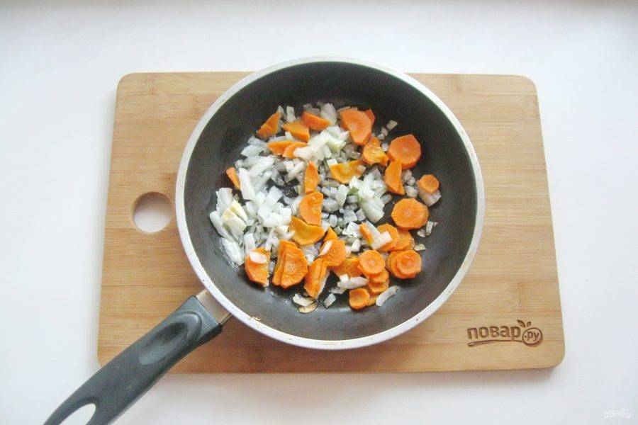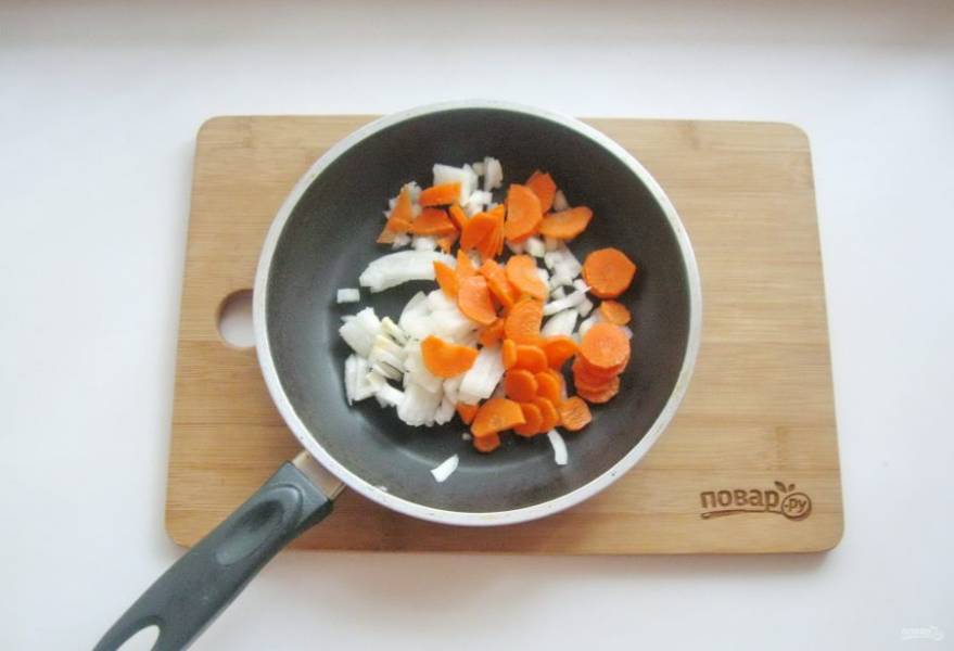 Морковь и репчатый лук мелко нарежьте и выложите в сковороду.