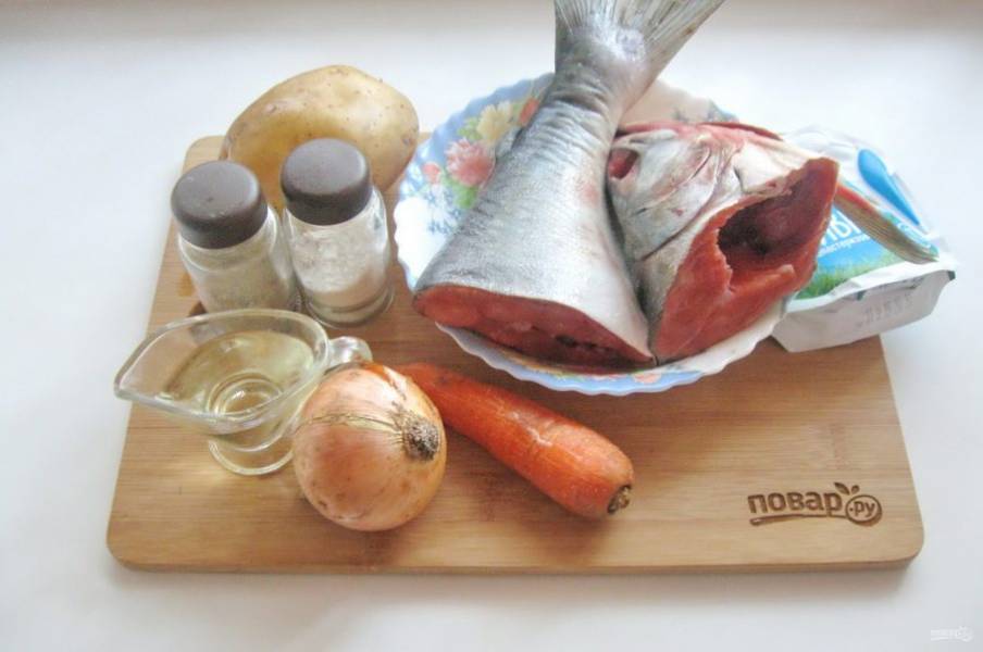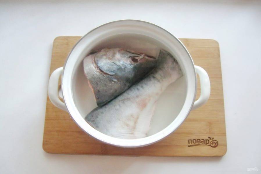 Горбушу очистите от чешуи и выпотрошите, хорошо помойте. Выложите в кастрюлю и залейте водой.