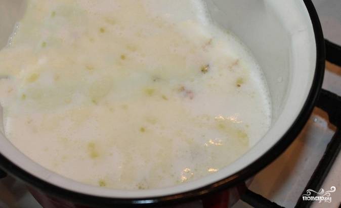 В эмалированной кастрюльке смешиваем сливки с водой и кипятим. В кипящую воду бросаем содержимое сковороды и чеснок (по желанию). Варим до готовности картошки.