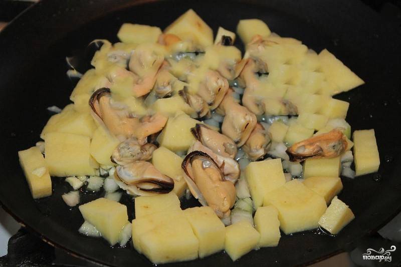 Очищаем картофель и режем кубиками. Мидии размораживаем, вынимаем ворс. Лук очищаем от шелухи и режем меленько. Обжариваем овощи и мидии на масле минут 5.