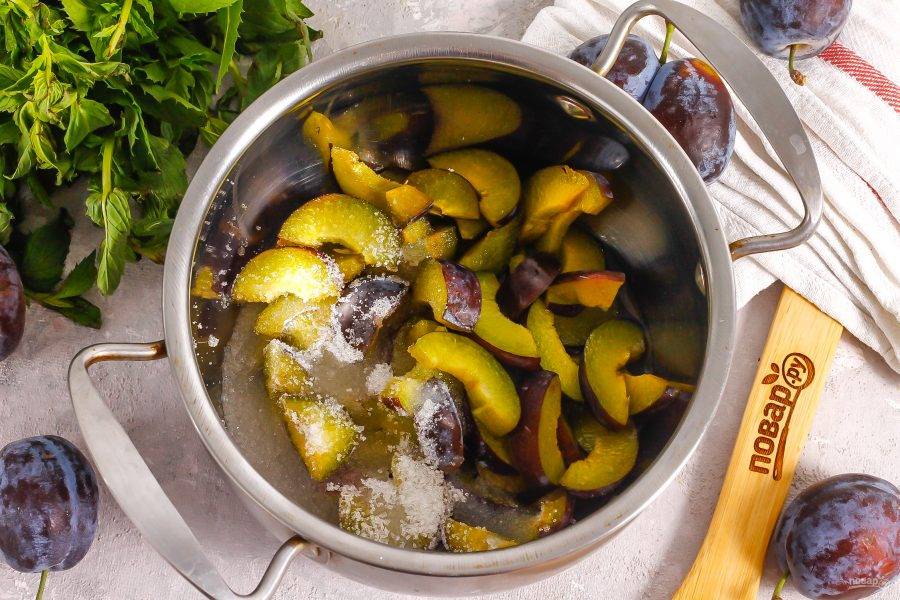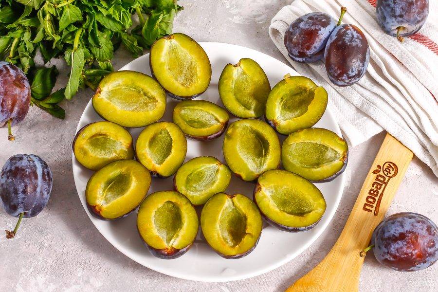 Сливы промойте в воде, удалите хвостики. Разделите каждый плод пополам и удалите косточку. Если плоды не слишком спелые, то разрежьте их ножом.