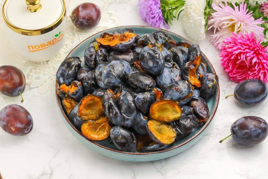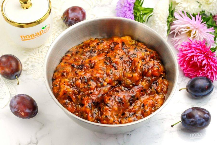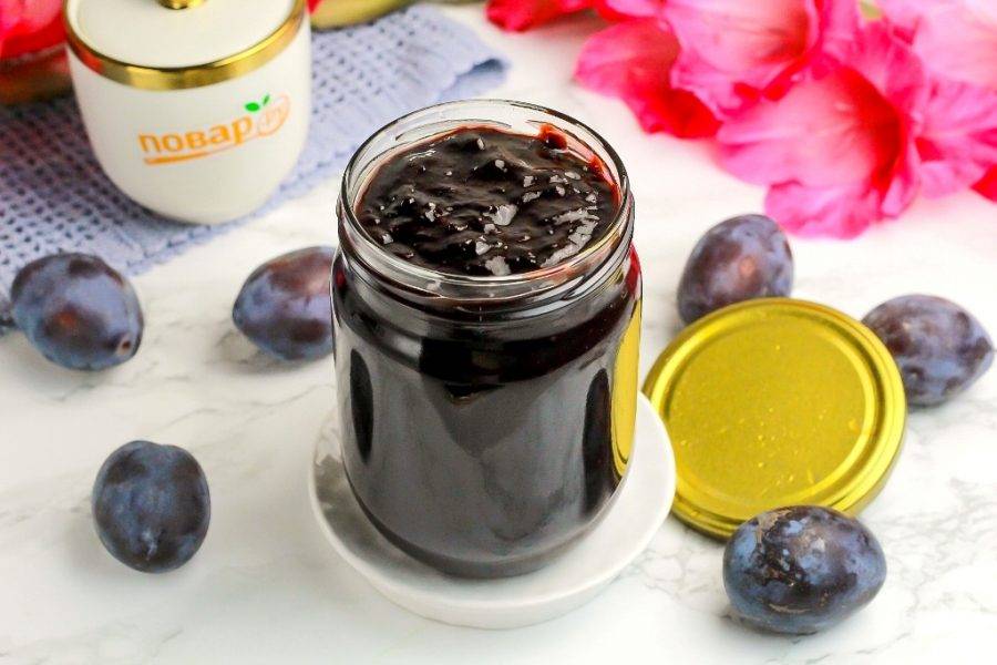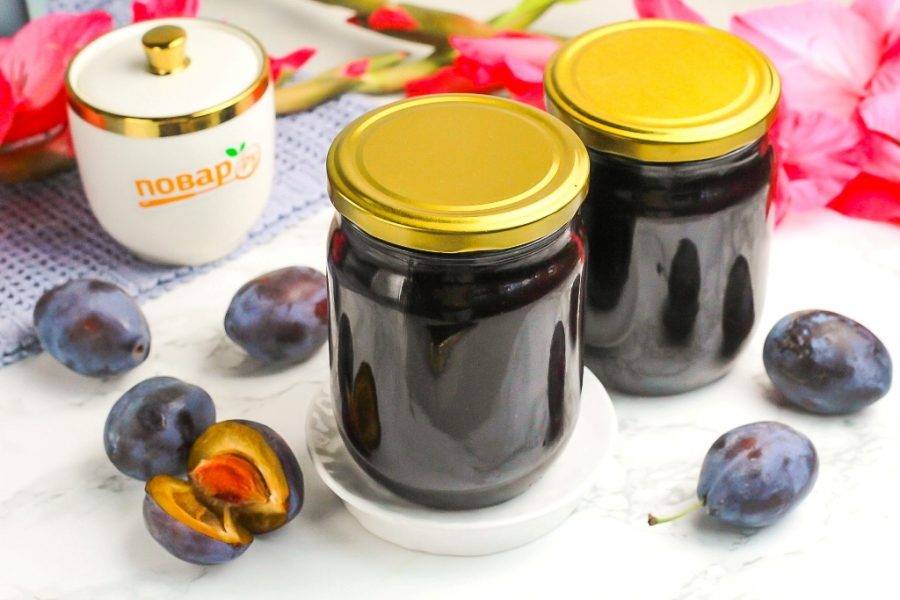 Закрутите крышки на банках с помощью ключа для консервации или просто по резьбе. Переворачивать их и проверять на плотность не нужно, если крышки с резьбой. Дайте остыть при комнатной температуре и перенесите в кладовую, где сухо и прохладно. При желании оставьте себе немного сливового повидла на пробу. Приятного вам аппетита!