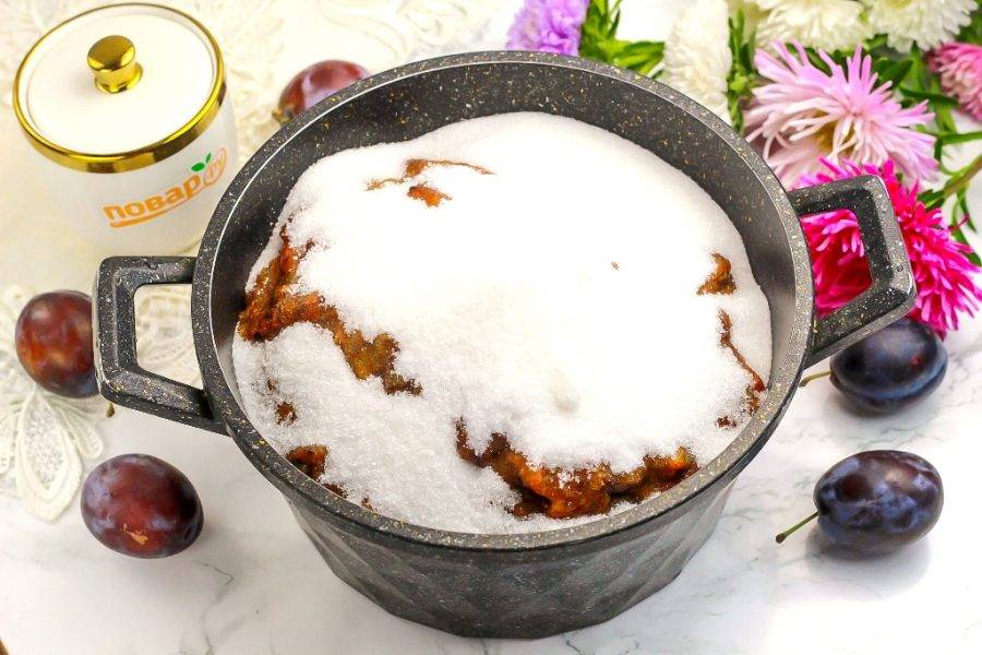 Отпюрируйте сливовую нарезку, измельчая ее на мясорубке, установив насадку с крупными ячейками. Если любите повидло без мелких кусочков фруктов, то установите насадку с мелкими ячейками.