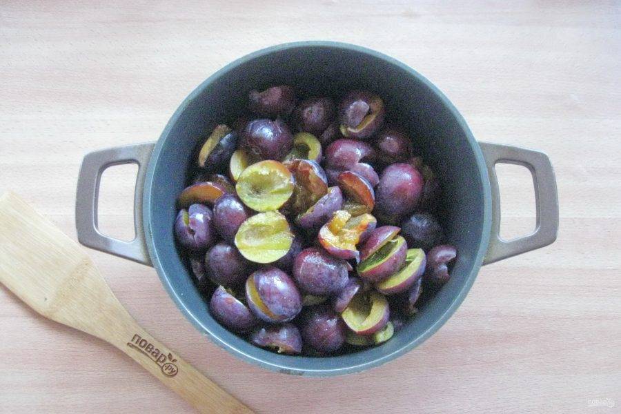 Разрежьте каждую сливу и удалите косточку. Гнилые и поврежденные плоды не берите. Выложите сливы в кастрюлю или таз с толстым дном или антипригарным покрытием.
