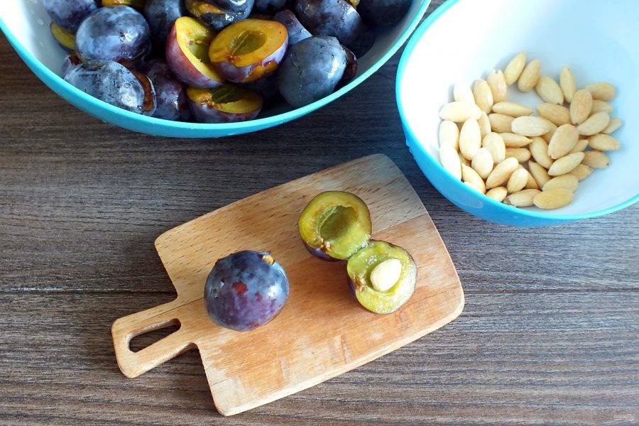У слив удалите косточки. Не разрезайте до конца плод, чтобы половинки остались соединенными.