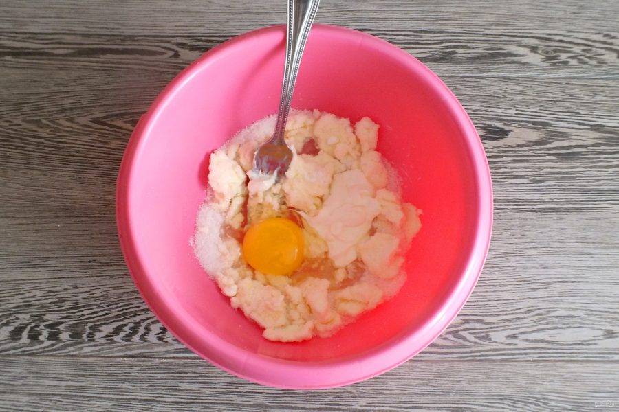 Добавьте яйцо, сметану. Перемешайте венчиком или вилкой. Сильно взбивать не нужно.