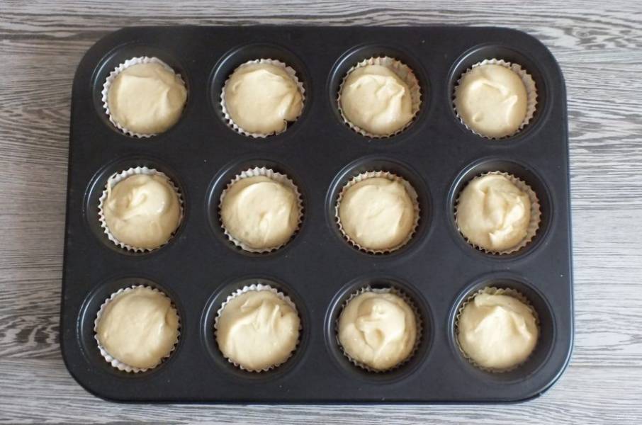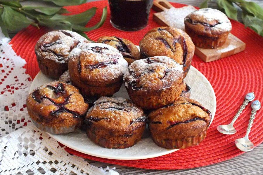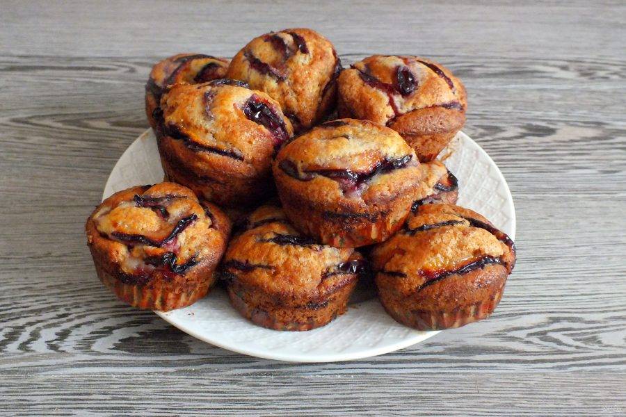 По истечении времени достаньте готовые маффины из духовки. Проверьте готовность деревянной шпажкой, она должна быть сухой. Готовую выпечку оставьте минут на 15 форме, после переложите на блюдо.