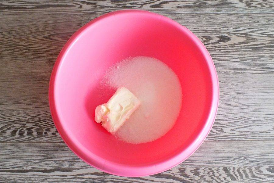 В чаше соедините мягкое масло и сахар. Разотрите вилкой.