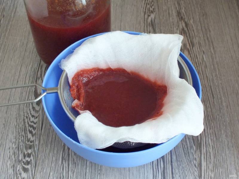 Ликёр процедите через 6 слоёв марли, застеленную в дуршлаг. Периодически мякоть убирайте ложкой, чтобы она не забивала ткань.