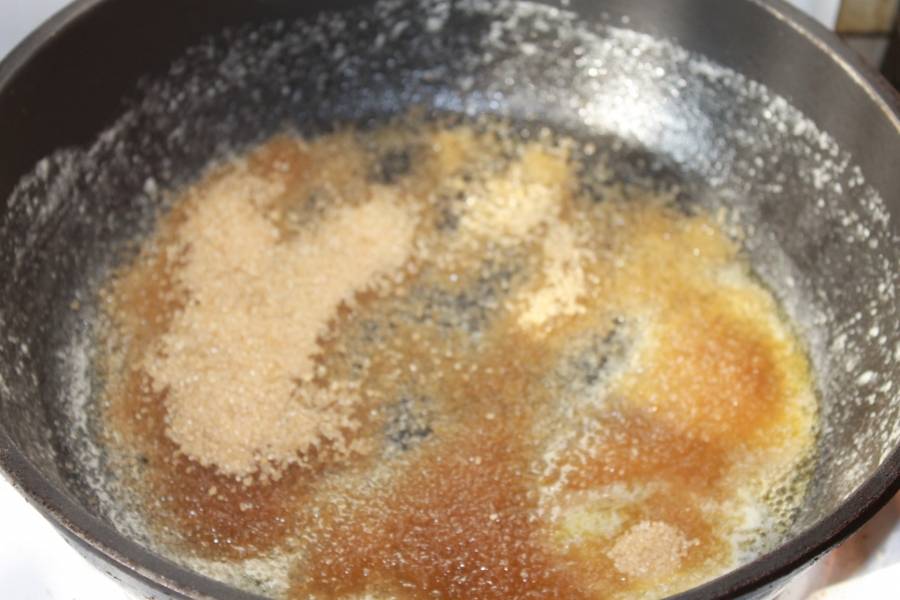 На сковороде со съемной ручкой топим сливочное масло 40г, крутим сковороду, чтоб масло растеклось на стенки, высыпаем 110г коричневого сахара. Ждем, когда начнет карамелизоваться.