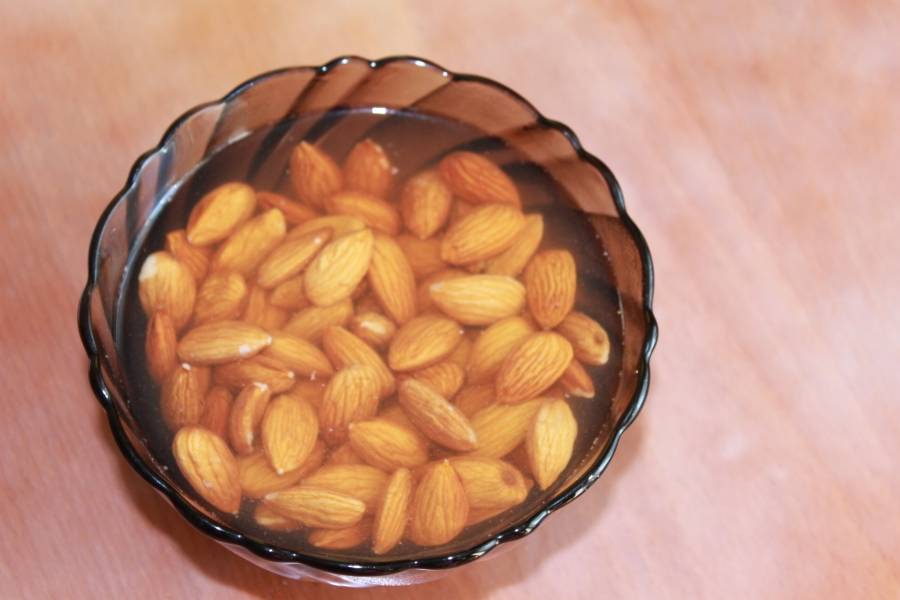Миндаль заливаем кипятком на 10 минут, после этого он хорошо чистится от шкурки. Чистим миндаль, сушим и смалываем на кофемолке в муку.