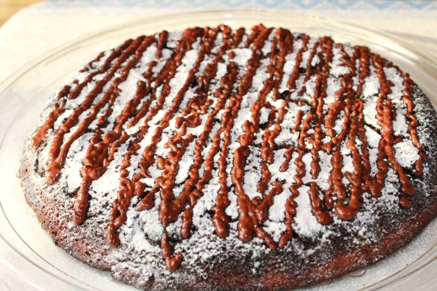 Украшала я глазурью, поместив ее в мешочек и сделав в нем маленькую дырочку. Получился вот такой пирог.