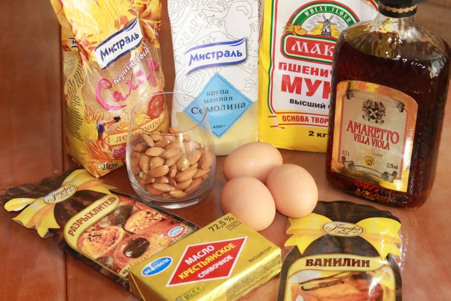 Размягченное сливочное масло 110г взбиваем со 100г сахара (в тесто можно взять обычный сахар) до растворения крупинок, не останавливая блендера, вводим по одному яйцу, ванилин, миндальную муку, чуть соли, всыпаем Амаретто, муку, разрыхлитель и семолину, все хорошо взбиваем.