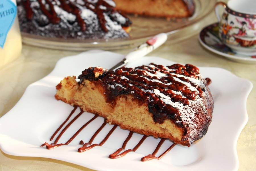 И переворачиваем. Даем остыть до комнатной температуры и посыпаем сахарной пудрой. Ни в коем случае не подумайте, что пирог подгорел. Это чернослив, смешавшись с коричневым сахаром и корицей, пропитал тесто. Это бесподобно вкусно.