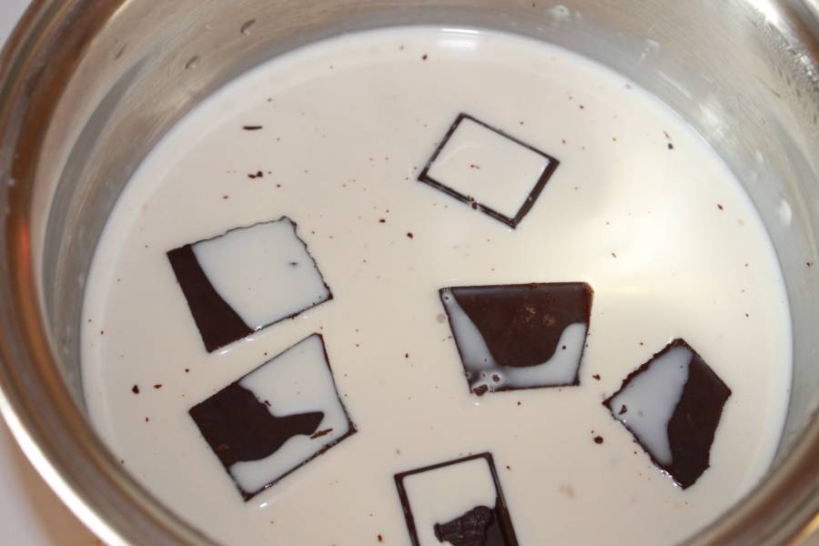 Из оставшихся сливок делаем шоколадную глазурь, нагрев их в кастрюльке с шоколадом до полного его растворения.